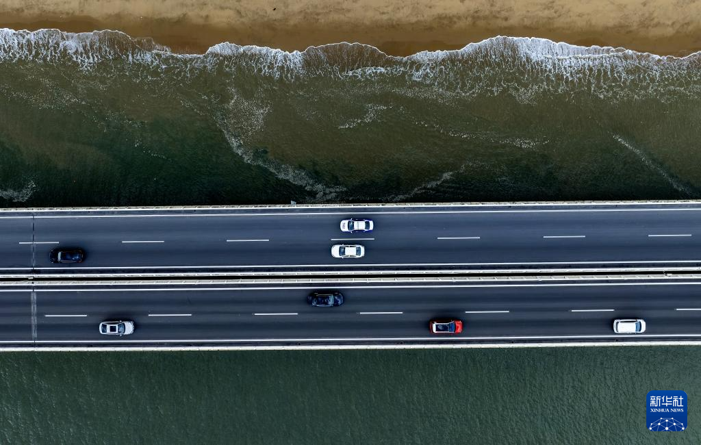 車輛行駛在廈門市演武大橋上。橋下,層層疊疊的海浪拍打著沙灘(9月4日攝,無人機照片)。