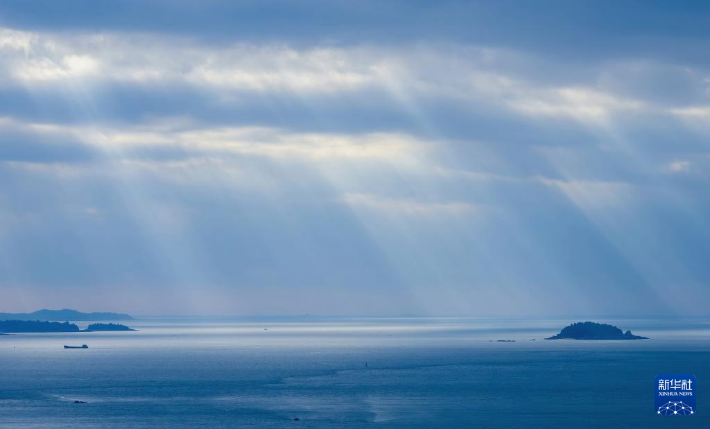 在廈門市演武大橋附近,光線穿過云層,灑落在海面和周邊小島上(9月4日攝,無人機照片)。