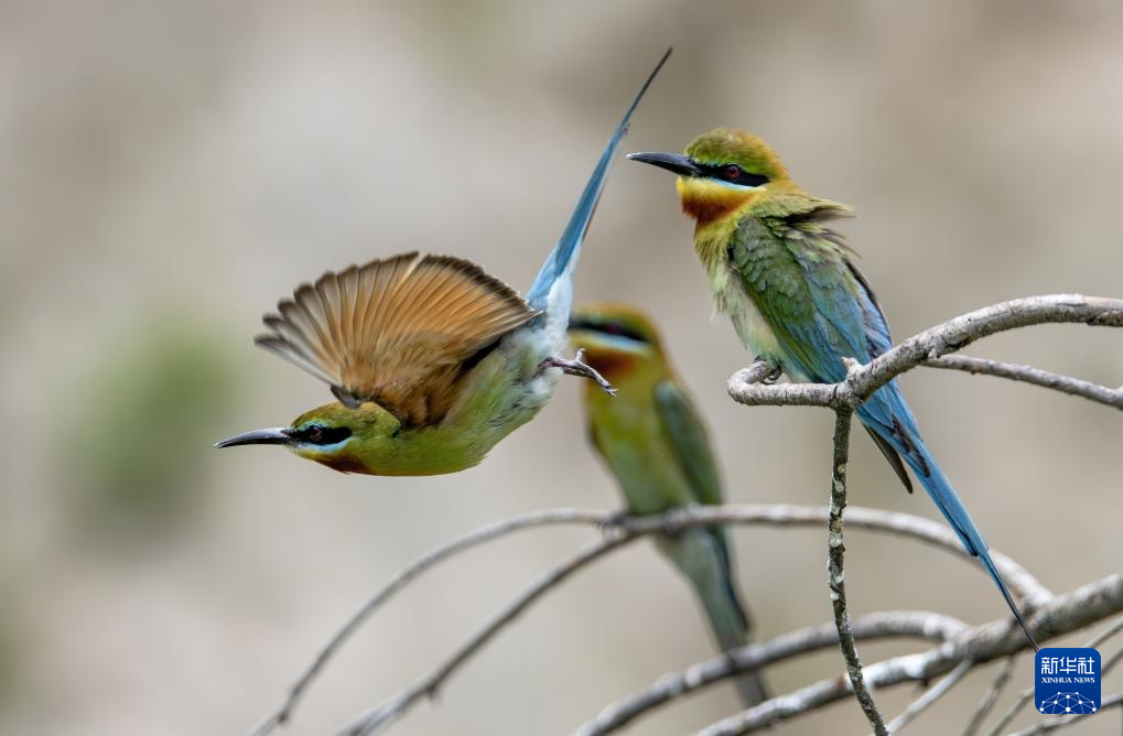 國家二級重點保護野生鳥類栗喉蜂虎在廈門五緣灣栗喉蜂虎保護區(qū)內(nèi)停留覓食(5月10日攝)。