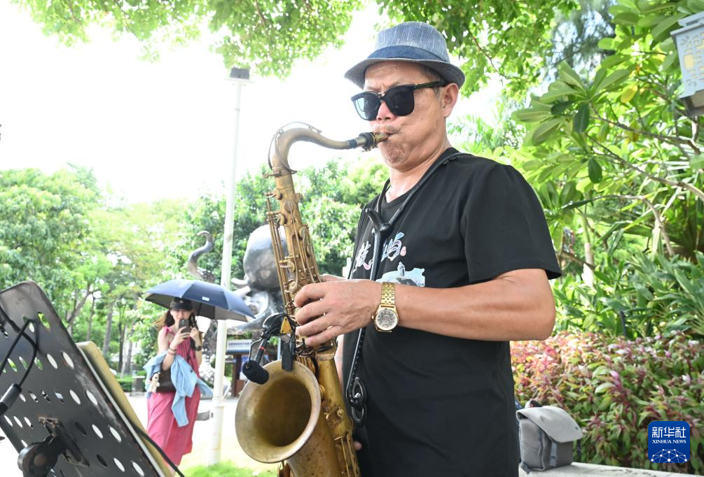 9月4日,街頭藝人在廈門鼓浪嶼為游客演奏薩克斯。