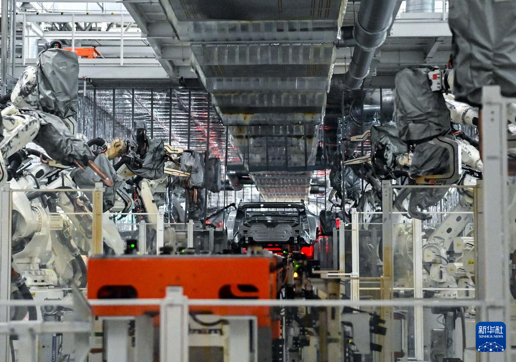 8月5日,在長(zhǎng)春市一汽紅旗制造中心繁榮廠區(qū)的焊裝車間內(nèi),焊裝機(jī)器人在生產(chǎn)線上焊接車身。