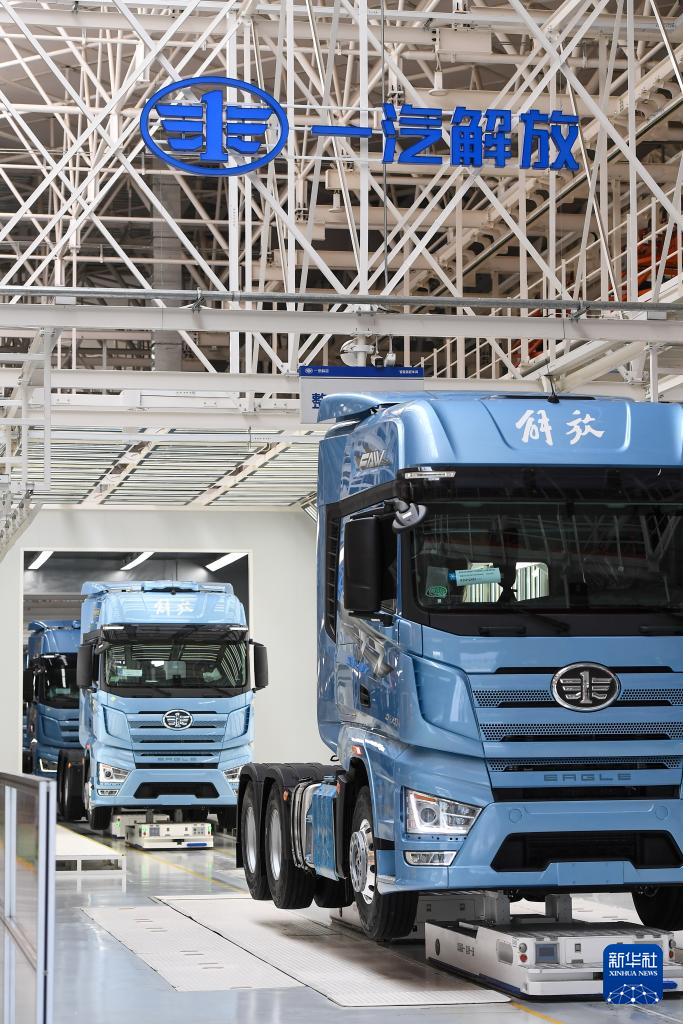 8月9日,在位于吉林長(zhǎng)春的一汽解放汽車有限公司J7智能工廠內(nèi),AGV搬運(yùn)機(jī)器人搬運(yùn)車輛行進(jìn)在生產(chǎn)線上。