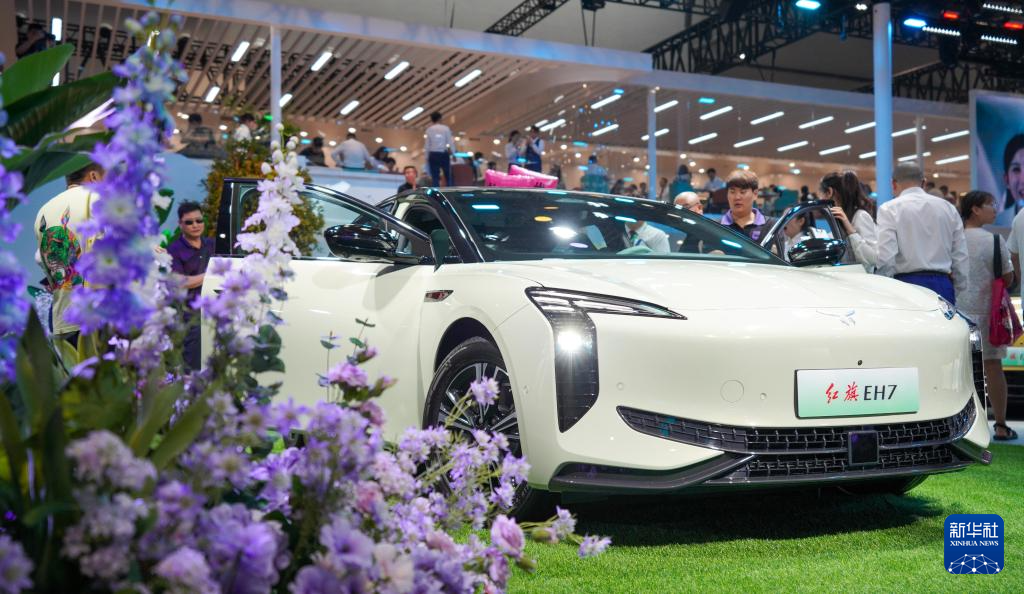 7月13日,觀眾在第21屆長(zhǎng)春國(guó)際汽車博覽會(huì)的紅旗品牌展區(qū)參觀EH7車型。