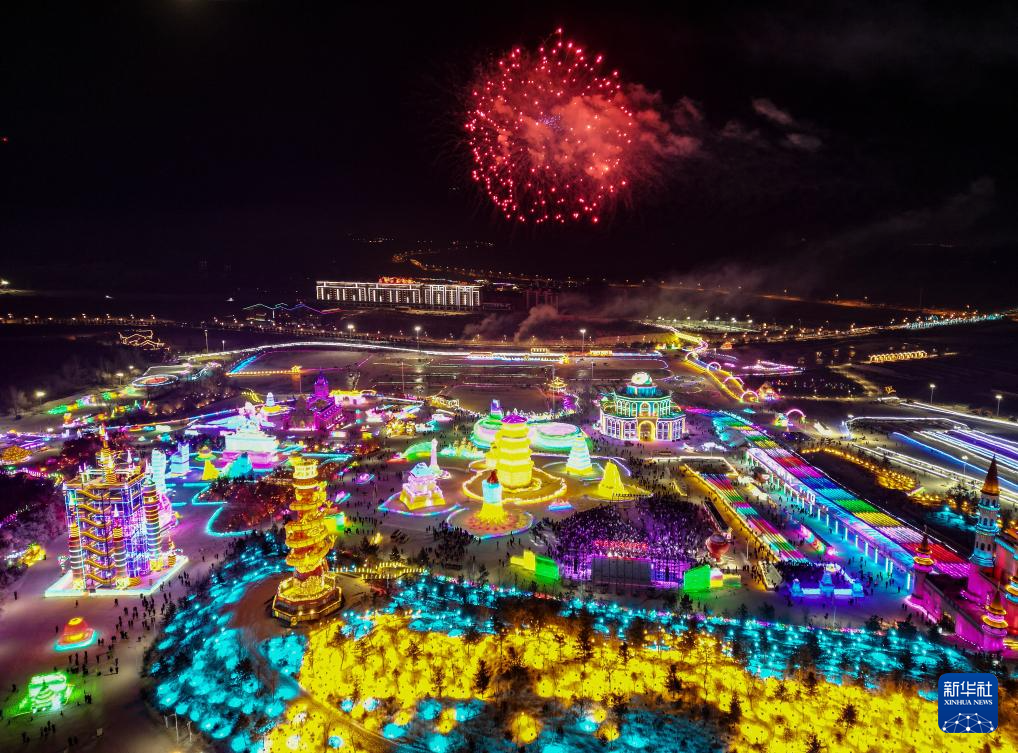 2月24日,游客在長(zhǎng)春冰雪新天地欣賞冰燈和煙花表演(無人機(jī)照片)。