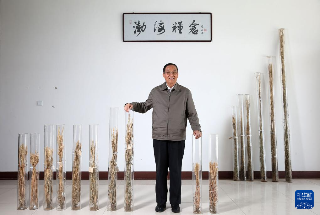 李振聲院士在中國(guó)科學(xué)院遺傳與發(fā)育生物學(xué)研究所農(nóng)業(yè)資源研究中心南皮生態(tài)農(nóng)業(yè)試驗(yàn)站展示歷次雜交后獲得的小麥品種的標(biāo)本(2014年5月5日攝)。 新華社記者金立旺攝