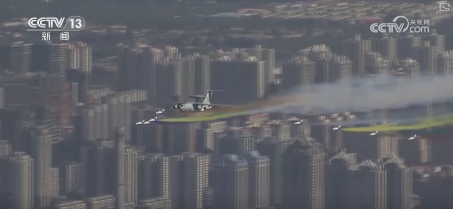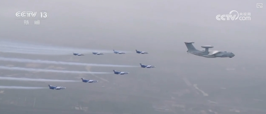 這是2009年10月1日,新中國(guó)成立60周年閱兵式上,機(jī)群飛過天安門廣場(chǎng)的壯觀場(chǎng)景。領(lǐng)航機(jī)型是我國(guó)自主研發(fā)的預(yù)警機(jī)空警2000和空警200,這也是中國(guó)預(yù)警機(jī)第一次在全球觀眾面前公開亮相。