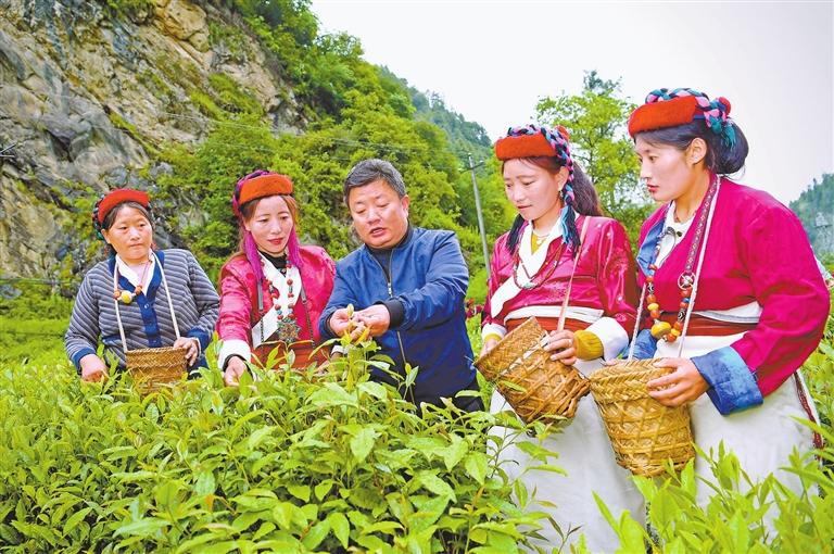 從貢日門(mén)巴民族鄉(xiāng)開(kāi)車(chē)去勒門(mén)巴民族鄉(xiāng)的路上,沿途的茶園風(fēng)景如畫(huà),尤其是到了采茶季節(jié),整個(gè)茶園洋溢著一片繁忙而和諧的景象。身著門(mén)巴族服飾的達(dá)瓦拉珍,腰間輕掛小巧的竹籃,在翠綠的茶樹(shù)間穿梭,手指輕盈地跳躍,一片片鮮嫩的綠芽便落入籃中。在她身后是勒門(mén)巴民族鄉(xiāng)茶葉農(nóng)牧民專(zhuān)業(yè)合作社茶園,遠(yuǎn)遠(yuǎn)望去茶樹(shù)依山傍水,在肥沃的土地上生根發(fā)芽。
