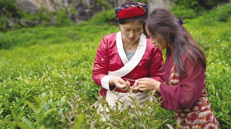 門(mén)巴族姑娘身著傳統(tǒng)服飾采茶。