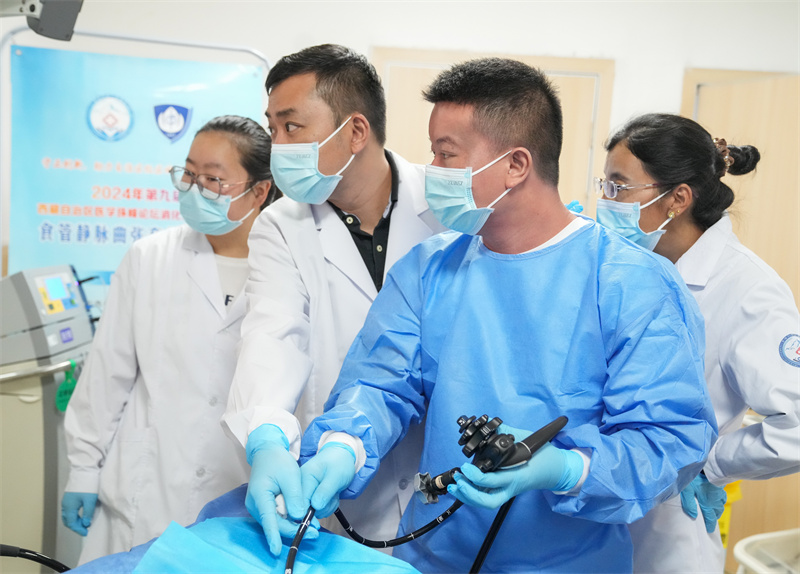 7月8日,在西藏日喀則市人民醫(yī)院,第九批醫(yī)療人才“組團式”援藏專家、復旦大學附屬中山醫(yī)院內(nèi)鏡中心副主任醫(yī)師胡健衛(wèi)(左二)指導徒弟張武(左三)進行內(nèi)鏡手術(shù)。新華社記者 丁汀 攝/新華社圖片庫