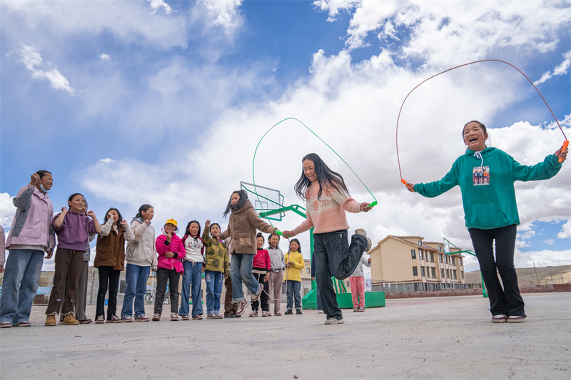 6月22日,西藏那曲市班戈縣中石化小學學生在操場上跳繩。作為目前全國海拔最高的援藏小學,班戈縣中石化小學有“離天空最近的援藏小學”之稱。新華社記者 丁增尼達 攝/新華社圖片庫