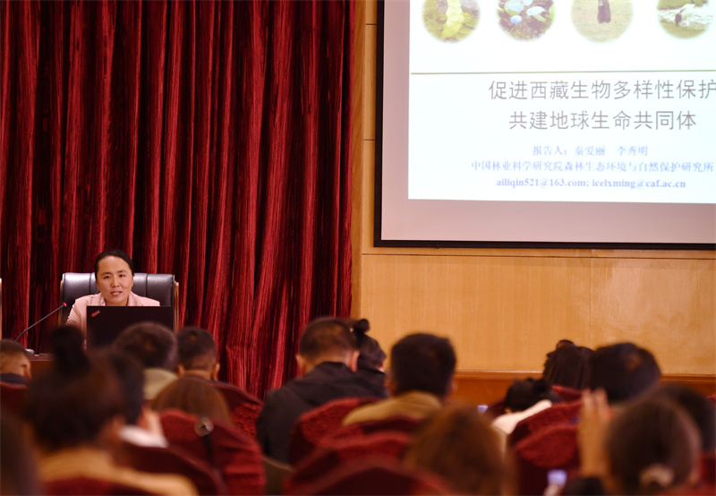 2023年9月5日,以西藏生物多樣性保護科普暨生態(tài)護林員探訪傳播為主題的林草科普援藏活動在西藏拉薩舉行,中國林業(yè)科學研究院副研究員秦愛麗為與會人員作生物多樣性保護知識講座。新華社記者 張汝鋒 攝/新華社圖片庫