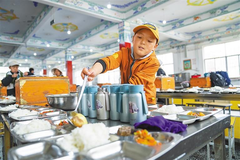 圖為那曲市班戈縣中石化小學(xué)學(xué)生在為同學(xué)們分發(fā)午餐(6月22日攝)。 新華社記者 丁增尼達(dá) 攝