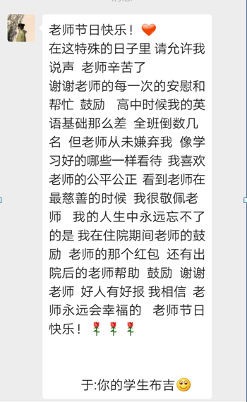 上大學(xué)時,?我?guī)е鴱哪抢飳W(xué)到的堅韌和自信,?踏入了這個全新的世界。?雖然大學(xué)生活與高中截然不同,?挑戰(zhàn)也更多,?但我始終記得您的教誨,?知道只要努力,?就沒有什么是不可能的。??每當(dāng)遇到困難,?我都會告訴自己,?就像您曾經(jīng)幫助我克服英語難題一樣,?我也能在這里找到屬于自己的路,于是更加堅定了前進(jìn)的決心。?