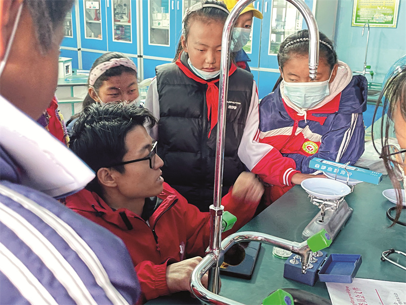 后來經(jīng)過層層選拔,王育帥成為了第十四批支教團(tuán)隊(duì)中的一員,在山南市瓊結(jié)縣完全小學(xué)負(fù)責(zé)一、二年級(jí)的科學(xué)課教學(xué)任務(wù)。在教學(xué)實(shí)踐中,他發(fā)現(xiàn)孩子們都有著無窮的好奇心,于是常常在課堂上啟發(fā)學(xué)生們領(lǐng)悟?qū)W習(xí)的意義,鼓勵(lì)他們立下階段性或者更長(zhǎng)遠(yuǎn)的目標(biāo)?!拔乙步?jīng)常在課堂上向?qū)W生們展示一些有趣的科學(xué)現(xiàn)象,讓他們根據(jù)現(xiàn)象探索背后的原理,很多學(xué)生還會(huì)利用周末時(shí)間主動(dòng)找我探討科學(xué)問題?!?/p>