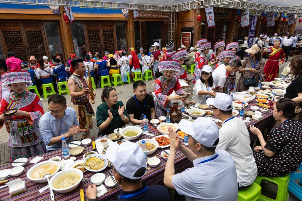 2023年4月20日,在四川省興文縣市民廣場舉行的四川省級非遺“興文苗族花山節(jié)”展示傳承活動上,嘉賓和游客體驗苗家長桌美食宴。新華社記者 江宏景 攝