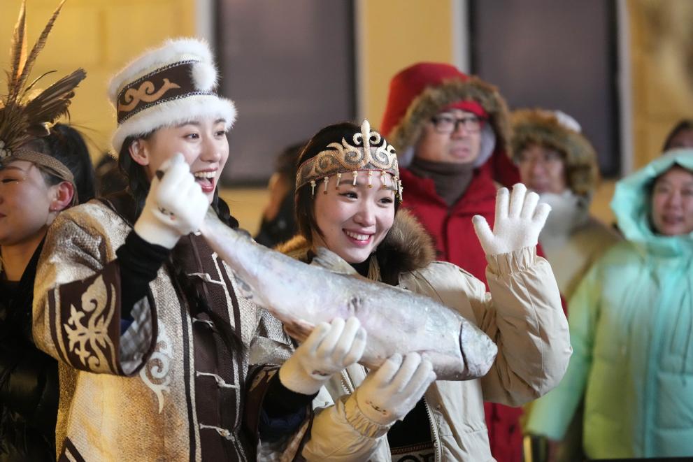 2024年1月6日,戴著魚皮頭飾的赫哲族姑娘(右)與黑龍江省饒河縣文旅推薦官在哈爾濱中央大街上推介家鄉(xiāng)特產(chǎn)魚品,讓天南海北的游客感受到濃郁的赫哲民族風(fēng)情。新華社記者 王建威 攝