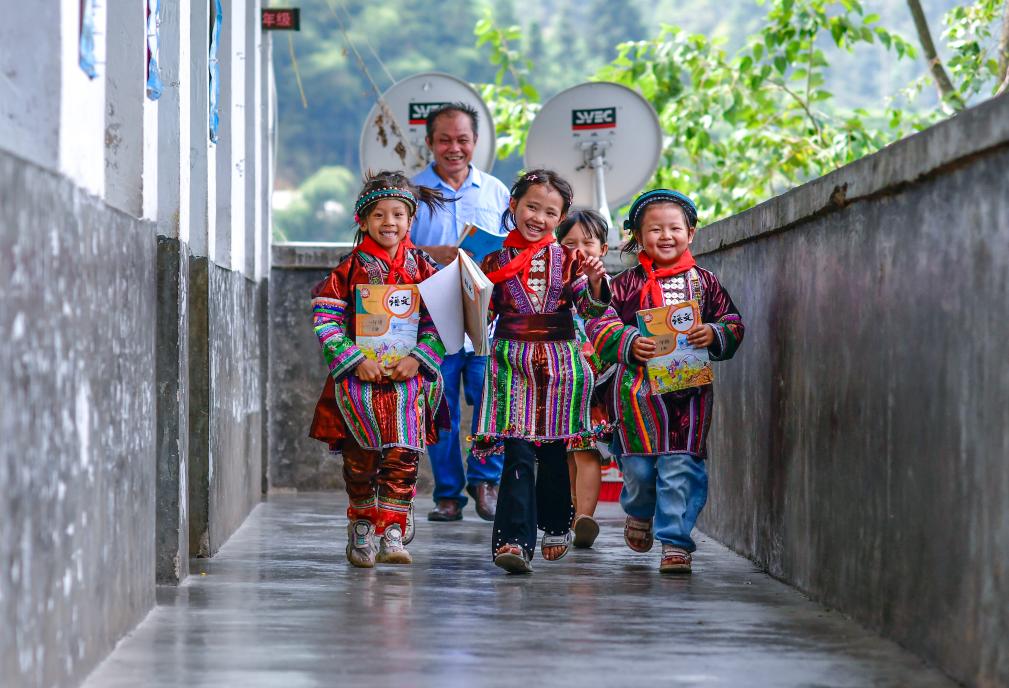 貴州省黔東南苗族侗族自治州從江縣西山鎮(zhèn)的中寨教學(xué)點,教師孟榮達(dá)(后)與學(xué)生們在下課后走出教室(2024年9月6日攝)。新華社記者 楊文斌 攝