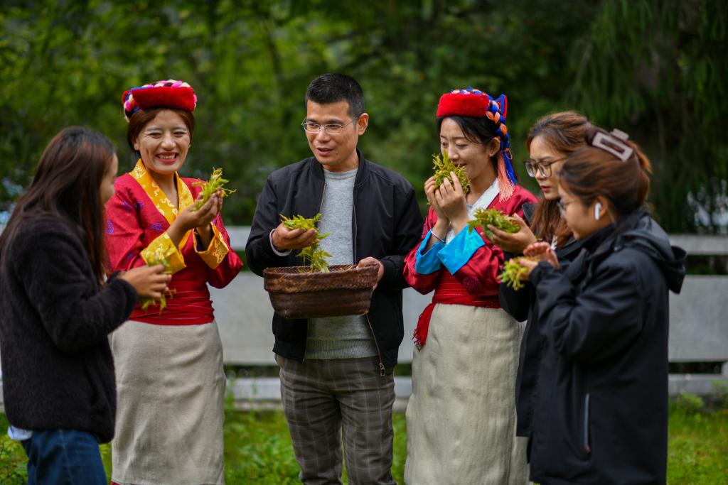安徽省援藏干部王天柱(左三)為西藏錯那市的貢日門巴民族鄉(xiāng)斯木村干部群眾講解莓茶采摘技術(shù)要求(2023年7月28日攝)。新華社記者 姜帆 攝