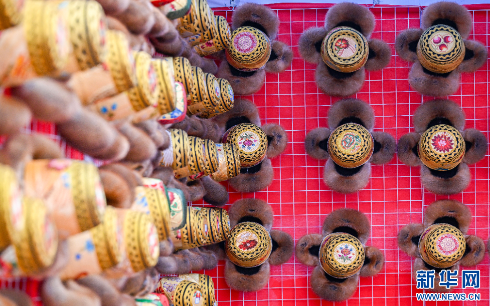 圖為西藏自治區(qū)山南市第45屆雅礱物資交流會(huì)上展示的金絲藏帽(12月1日攝)。新華網(wǎng) 旦增努布 攝