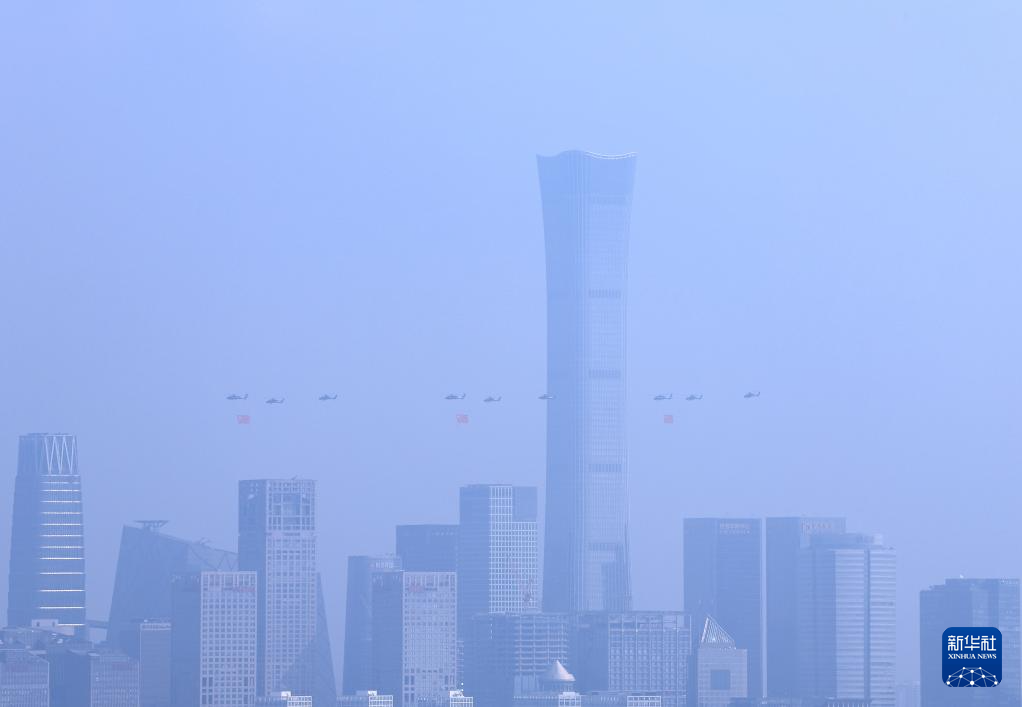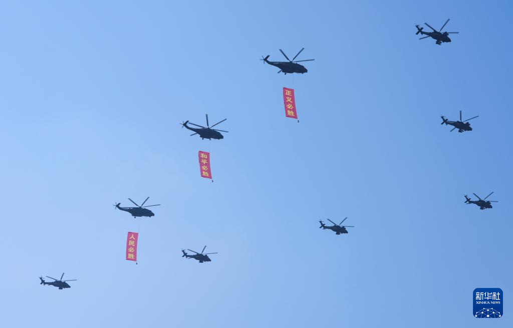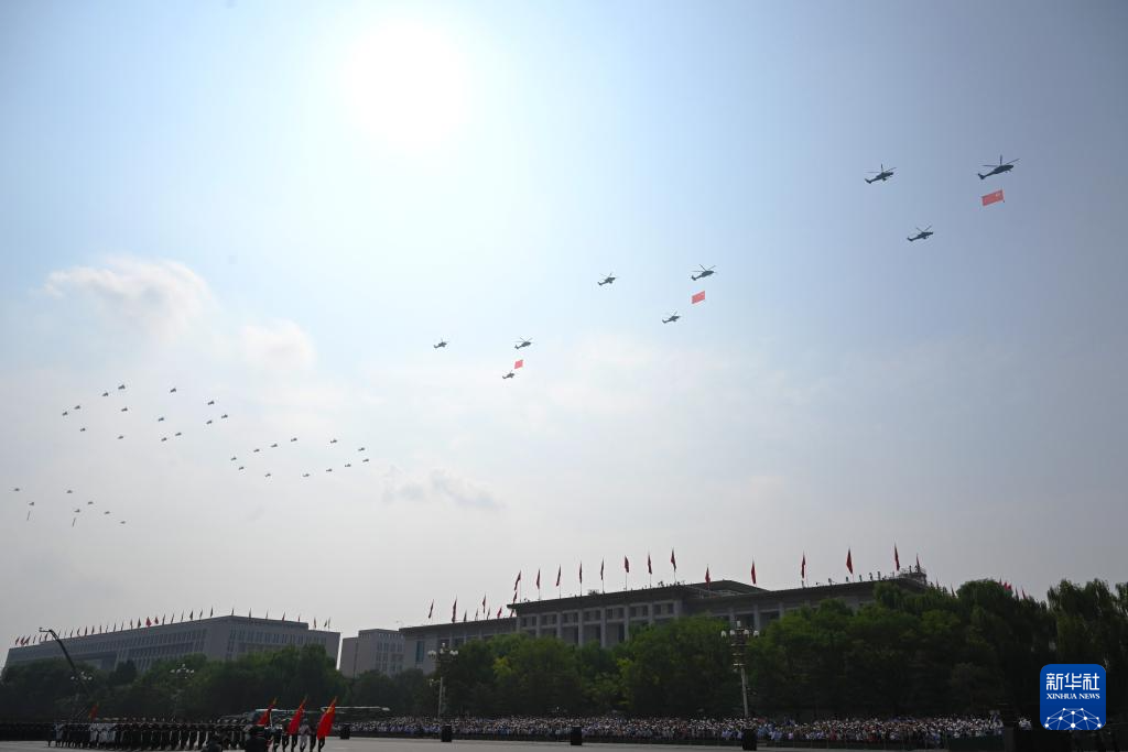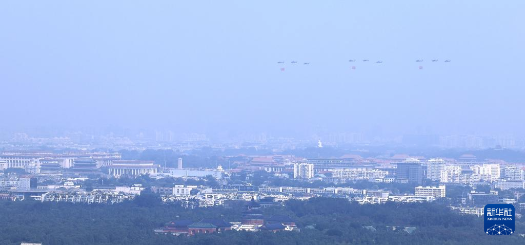 9月3日,紀(jì)念中國人民抗日戰(zhàn)爭暨世界反法西斯戰(zhàn)爭勝利80周年大會(huì)在北京隆重舉行。這是空中護(hù)旗梯隊(duì)。