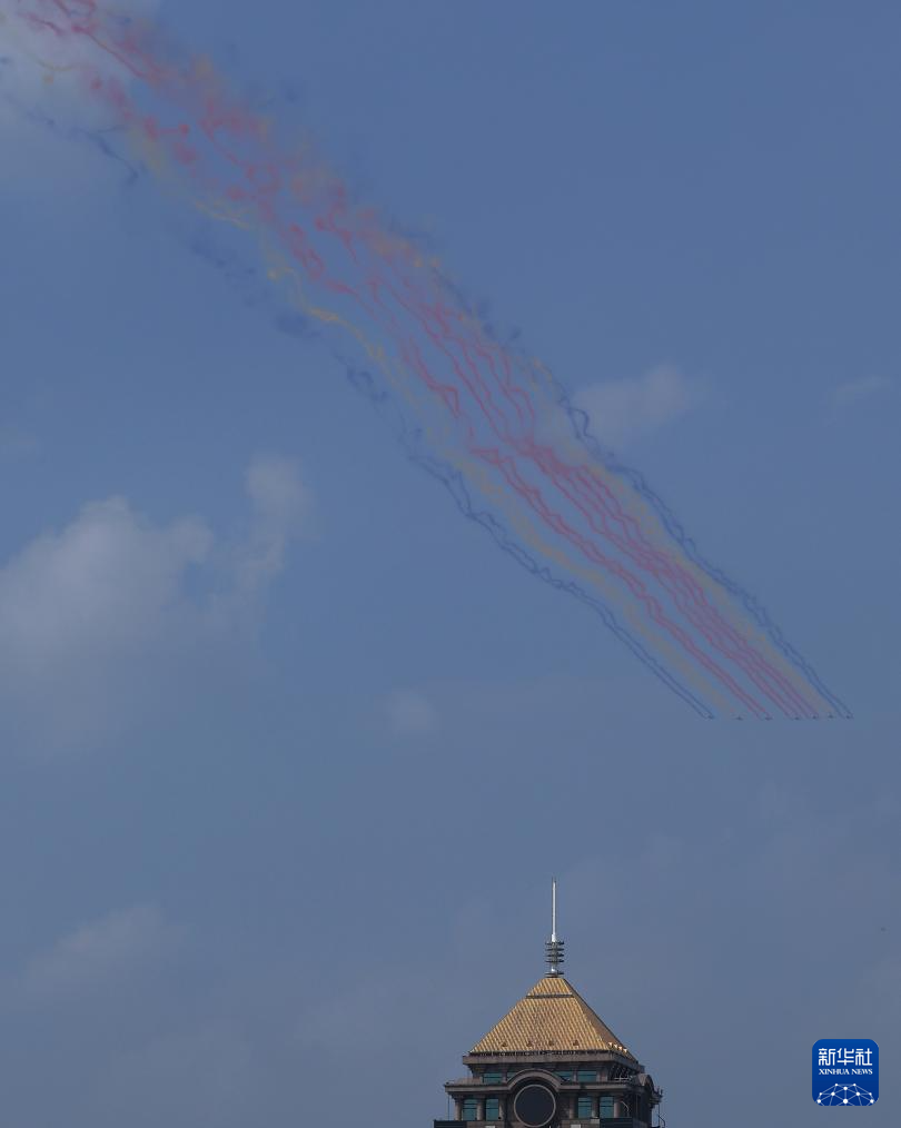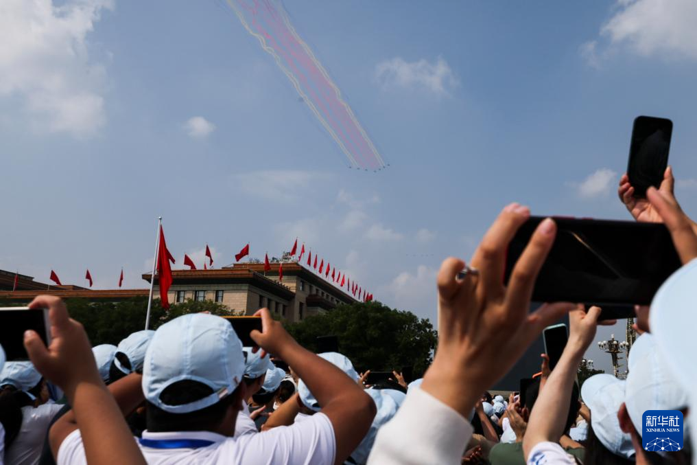 9月3日,紀念中國人民抗日戰(zhàn)爭暨世界反法西斯戰(zhàn)爭勝利80周年大會在北京隆重舉行。這是觀眾拍攝教練機梯隊接受檢閱。