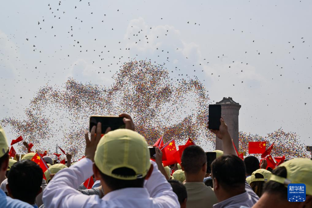 9月3日,紀念中國人民抗日戰(zhàn)爭暨世界反法西斯戰(zhàn)爭勝利80周年大會在北京隆重舉行。這是觀眾拍攝紀念大會現(xiàn)場放飛氣球和鴿子。