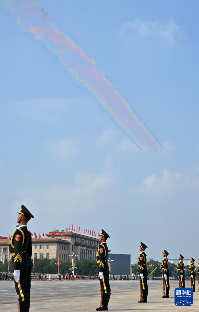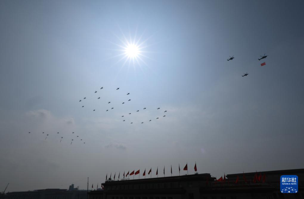 9月3日,紀(jì)念中國(guó)人民抗日戰(zhàn)爭(zhēng)暨世界反法西斯戰(zhàn)爭(zhēng)勝利80周年大會(huì)在北京隆重舉行。這是空中護(hù)旗梯隊(duì)通過天安門廣場(chǎng)。