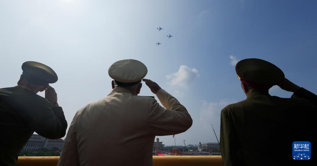 9月3日,紀念中國人民抗日戰(zhàn)爭暨世界反法西斯戰(zhàn)爭勝利80周年大會在北京隆重舉行。這是轟炸機梯隊飛過天安門廣場上空時嘉賓敬禮。