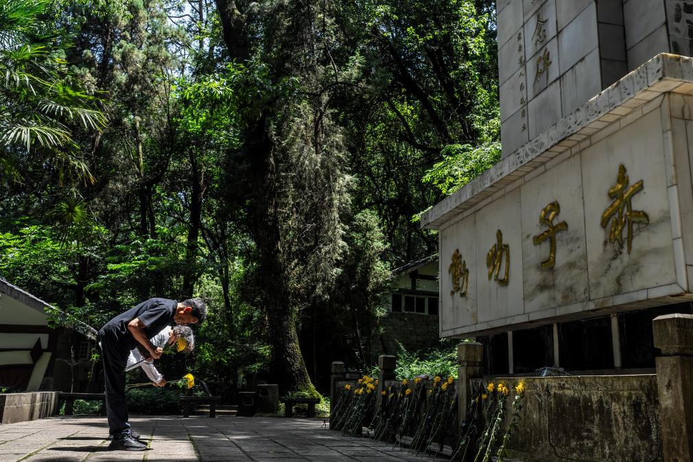 2025年7月18日,在昆明市西山森林公園,張云鵬(前)和妹妹張昆玉向南洋華僑機(jī)工抗日紀(jì)念碑鞠躬。