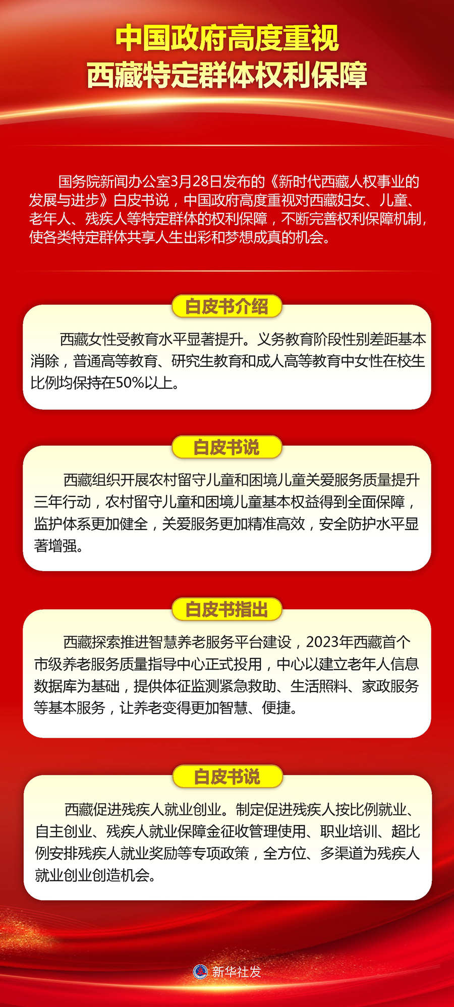 國(guó)務(wù)院新聞辦公室28日發(fā)布的《新時(shí)代西藏人權(quán)事業(yè)的發(fā)展與進(jìn)步》白皮書(shū)說(shuō),中國(guó)政府高度重視對(duì)西藏婦女、兒童、老年人、殘疾人等特定群體的權(quán)利保障,不斷完善權(quán)利保障機(jī)制,使各類(lèi)特定群體共享人生出彩和夢(mèng)想成真的機(jī)會(huì)。