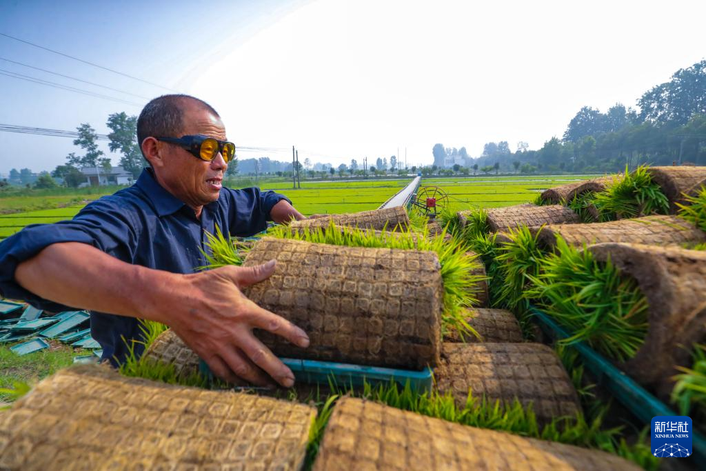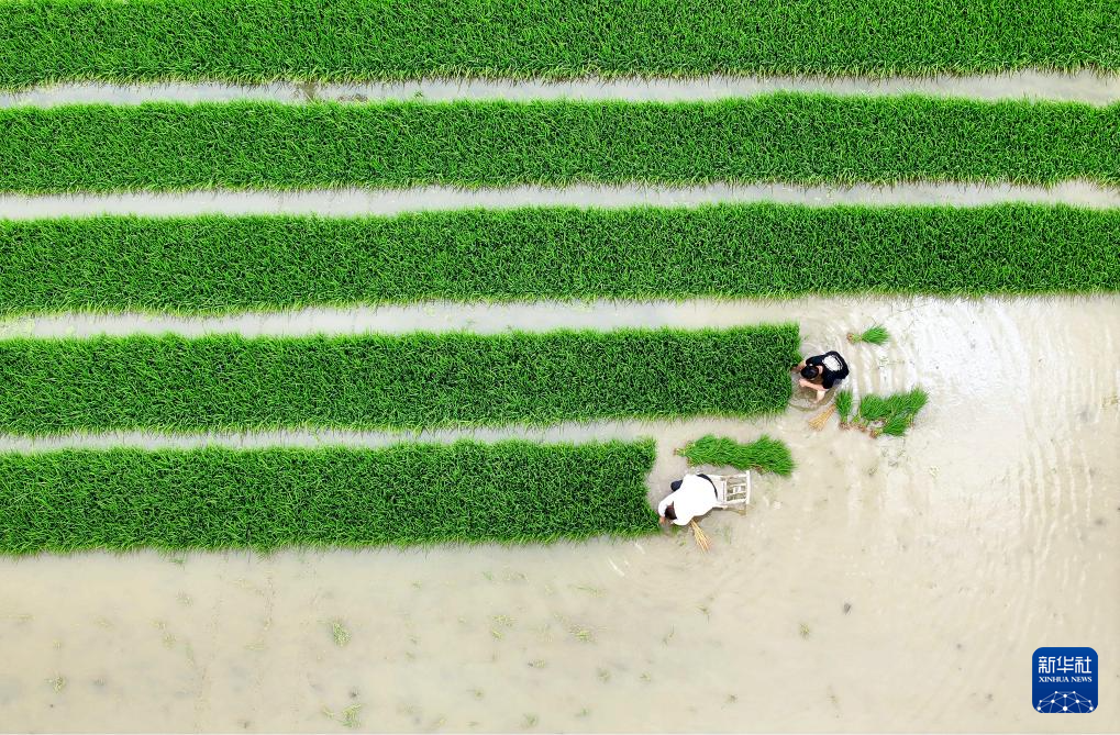 5月28日,河南省信陽市光山縣羅陳鄉(xiāng)張樓村青龍河合作社社員在田間起秧苗。新華社發(fā)(謝萬柏攝)