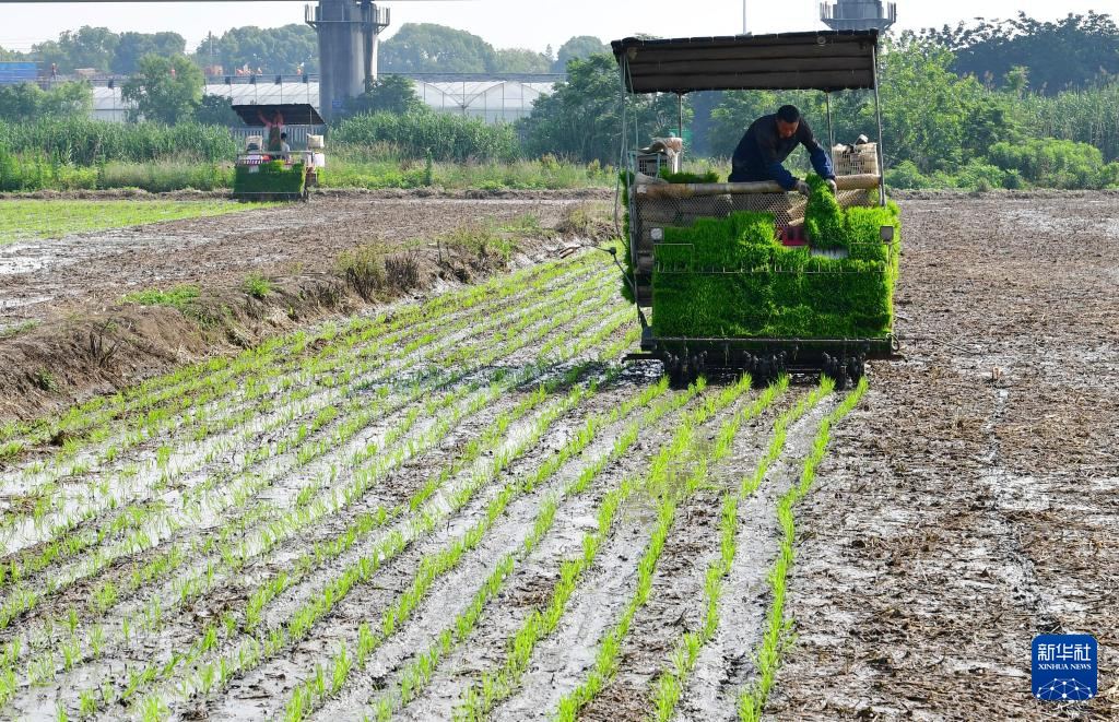6月4日,在江蘇省無錫市惠山區(qū)洛社鎮(zhèn),農(nóng)民操作插秧機插秧。新華社發(fā)(還月亮攝)