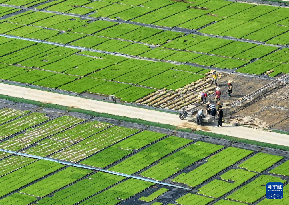 6月4日,在江蘇省常州市天寧區(qū)青龍街道武城村育秧基地,合作社社員準(zhǔn)備把培育好的秧苗移植到田間(無人機照片)。新華社發(fā)(王棟棟攝)