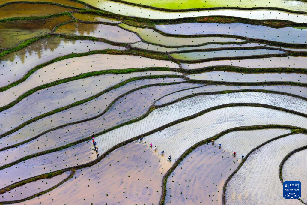 6月4日,云南省文山市新平街道高末社區(qū)茂地村的農(nóng)民在田間栽插水稻秧苗(無人機照片)。新華社發(fā)(熊平祥攝)
