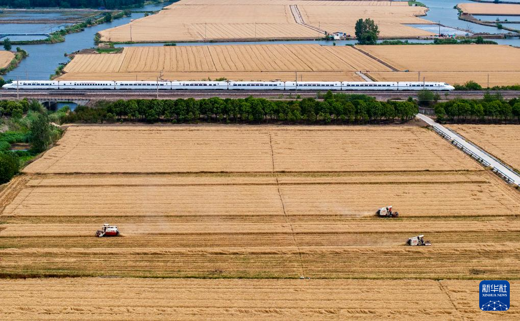 5月31日,在江蘇省興化市陳堡鎮(zhèn)四林村,農(nóng)機手駕駛收割機收割小麥(無人機照片)。新華社發(fā)(周社根攝)