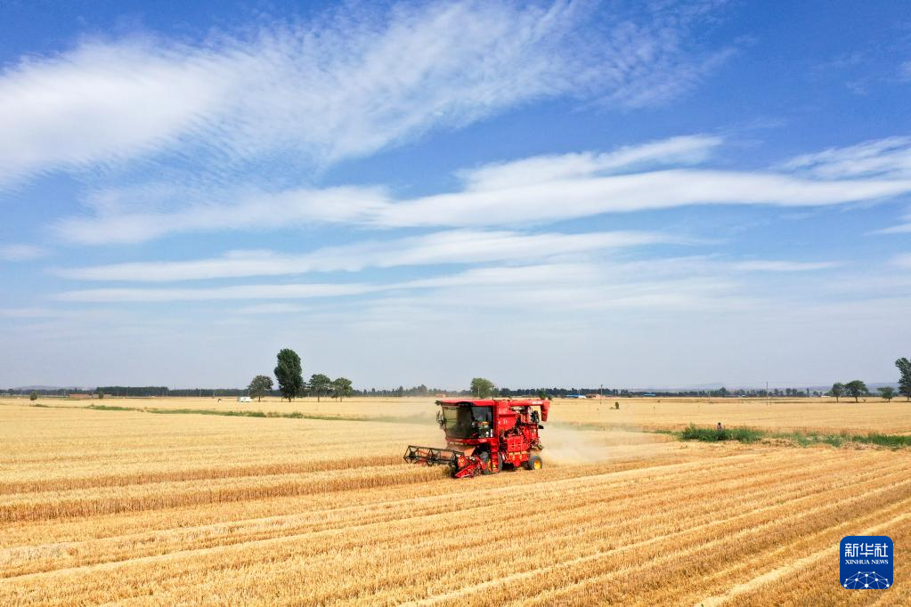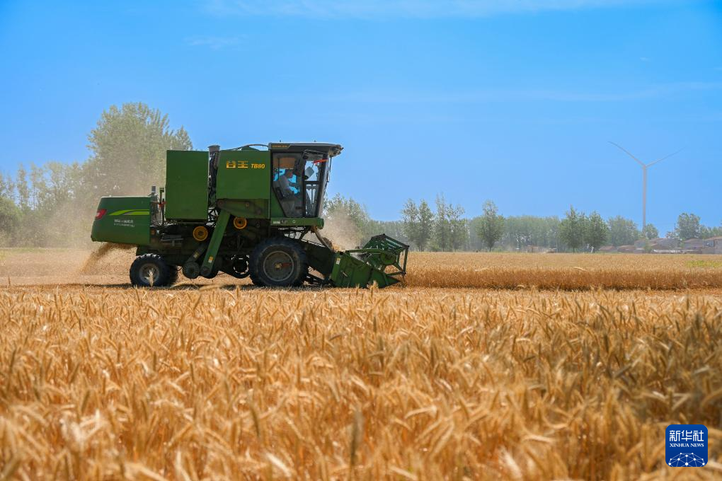 6月4日,在山東省東營市廣饒縣李鵲鎮(zhèn)皮里村的麥田里,農(nóng)民駕駛收割機收割小麥。新華社發(fā)(劉云杰攝)