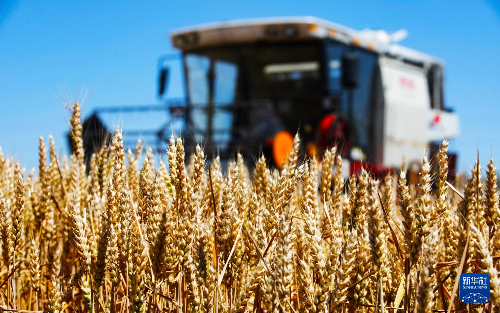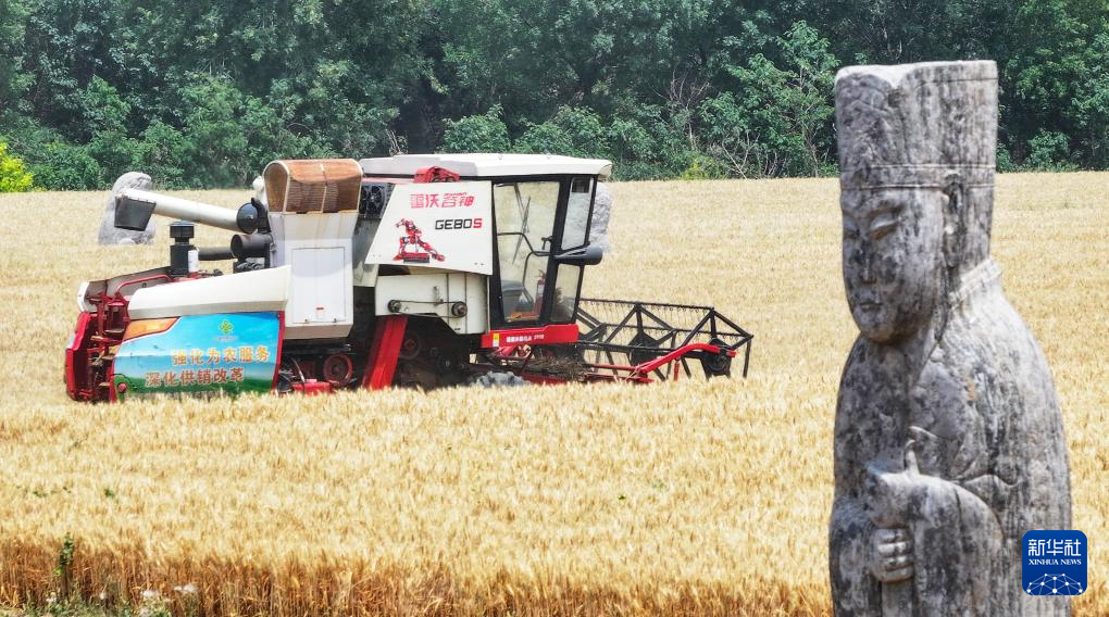 6月2日,在河南省鞏義市永熙陵,農(nóng)民駕駛收割機收割小麥。新華社發(fā)(馬健攝)