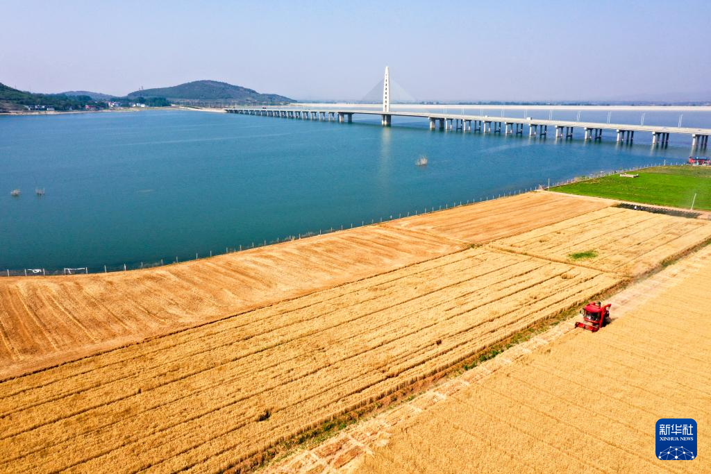 6月4日,山東省棗莊市山亭區(qū)山城街道東江村農(nóng)民在靈芝湖畔的麥田里收割小麥(無人機照片)。新華社發(fā)(劉明攝)
