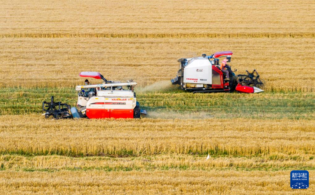 5月28日,收割機在江蘇省泰州市海陵區(qū)蘇陳鎮(zhèn)徐莊村的麥田里收獲小麥(無人機照片)。新華社發(fā)(湯德宏攝)