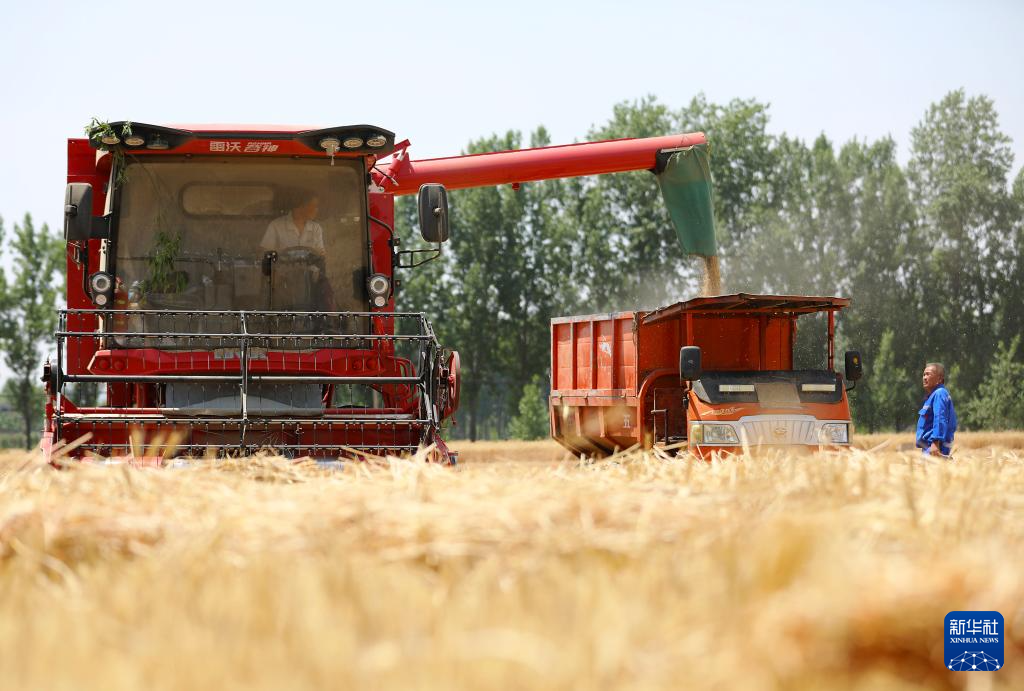 6月4日,在山東省滕州市羊莊鎮(zhèn)南于村,聯(lián)合收割機卸下剛收獲的小麥。新華社發(fā)(孫楊攝)