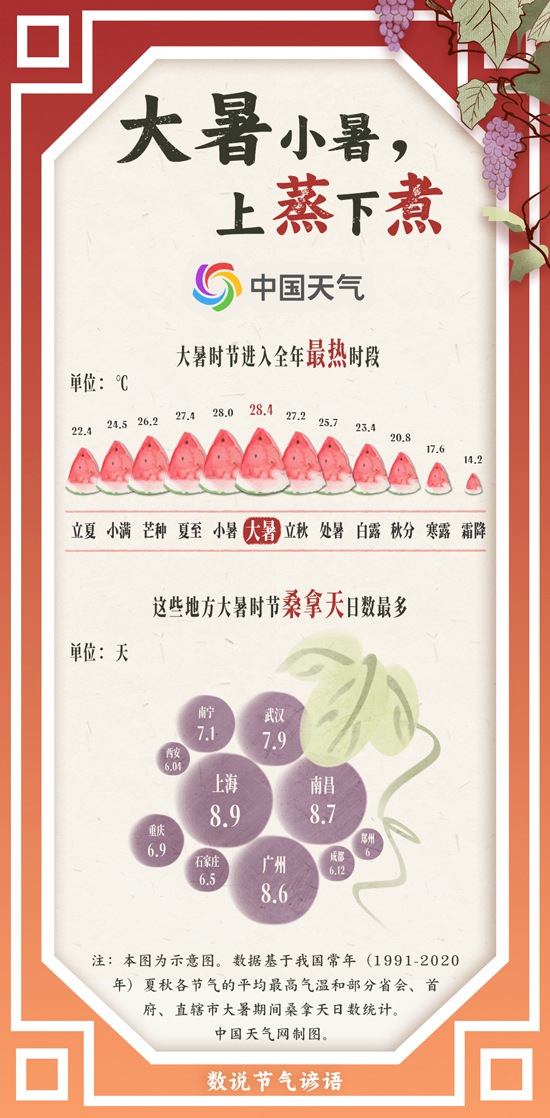 今天(7月22日),我國(guó)進(jìn)入夏季的最后一個(gè)節(jié)氣——大暑。此時(shí),三伏已至,暑熱交蒸將達(dá)到巔峰。大暑時(shí)節(jié)的諺語離不開一個(gè)“熱”字,“大暑小暑,上蒸下煮”、“大暑前后,衣裳濕透”……在潮濕悶熱的大暑節(jié)氣,哪些地方桑拿天最為頻繁呢?