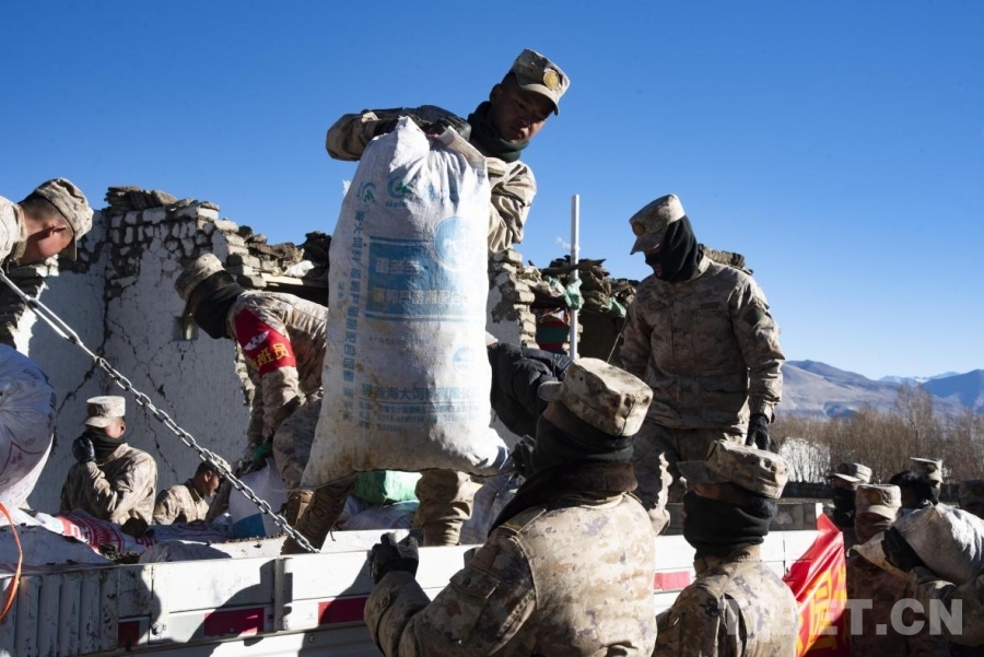 圖為在定日縣長(zhǎng)所鄉(xiāng)嘎旦村解放軍官兵正在幫助受災(zāi)群眾搬運(yùn)社會(huì)各界所捐贈(zèng)的物資(攝于2025年1月8日) 攝影:趙振宇