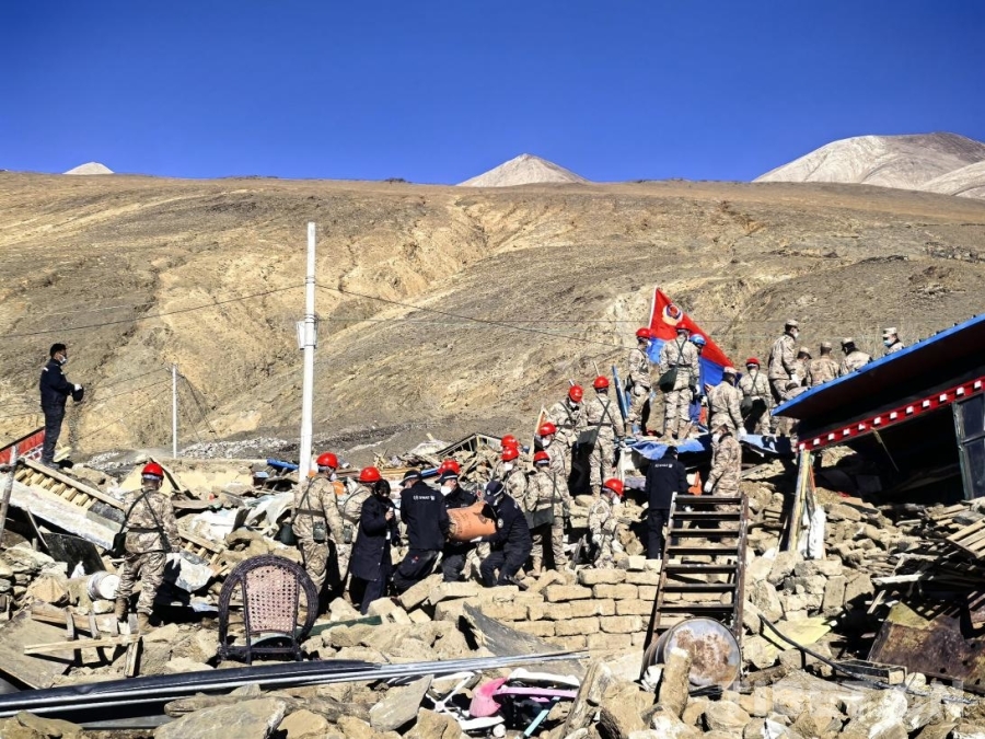 大地撕裂的瞬間,定日的山川記住了疼痛。這些影像定格了災(zāi)難降臨時(shí)的原始模樣——倒塌的房屋、揚(yáng)起的塵土、撕裂的大地。但在滿目瘡痍中,更震撼的是那些逆行身影:人民子弟兵、消防救援隊(duì)伍、移民管理警察、公安干警與當(dāng)?shù)馗刹吭趶U墟上的緊急救援,一雙雙沾滿泥土的手在瓦礫中尋找生命的跡象。災(zāi)難過后,是無數(shù)人日夜兼程奔赴的開始。