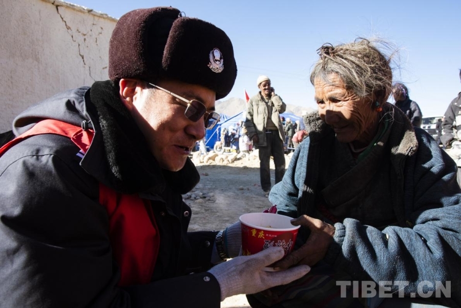 圖為在定日縣曲洛鄉(xiāng)措昂村受災(zāi)安置點(diǎn),剛剛換崗的公安民警將自己手中的早飯送到受災(zāi)群眾的手中(攝于2025年1月9日) 攝影:趙振宇