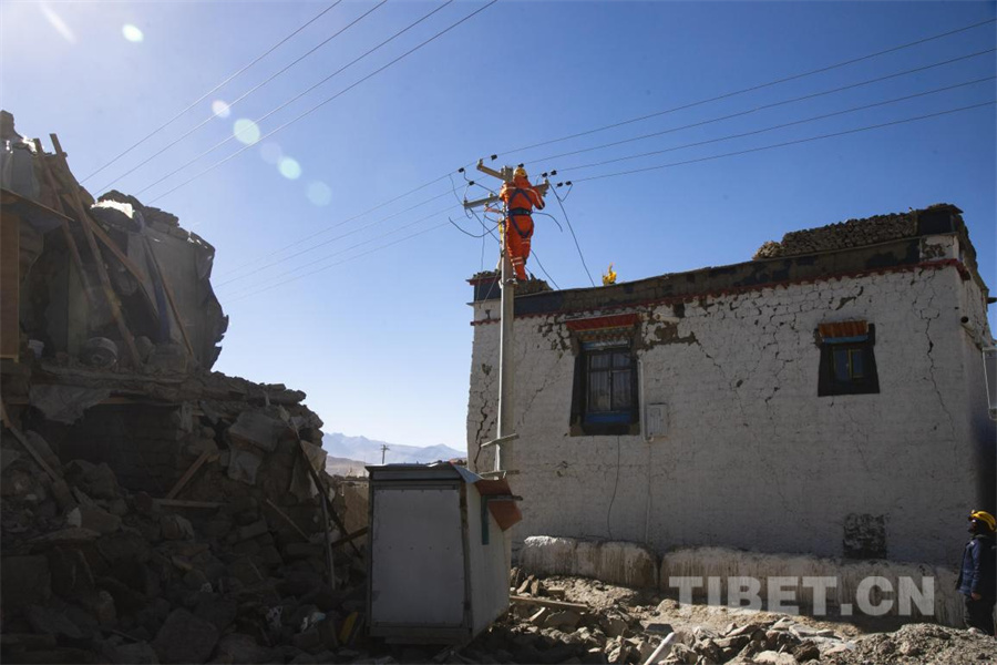 圖為地震發(fā)生第三日,在定日縣長(zhǎng)所鄉(xiāng)森嘎村國(guó)家電網(wǎng)工作人員為受災(zāi)群眾安置點(diǎn)恢復(fù)電力供應(yīng)(攝于2025年1月9日) 攝影:趙振宇