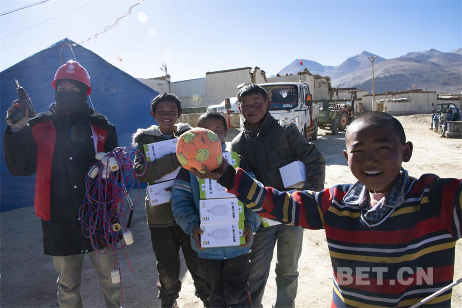 圖為地震發(fā)生第三日,在定日縣曲洛鄉(xiāng)措昂村國(guó)家電網(wǎng)工作人員為受災(zāi)群眾安置點(diǎn)通電,孩子們開心地加入工作人員的隊(duì)伍中隨時(shí)搭把手(攝于2025年1月9日) 攝影:趙振宇