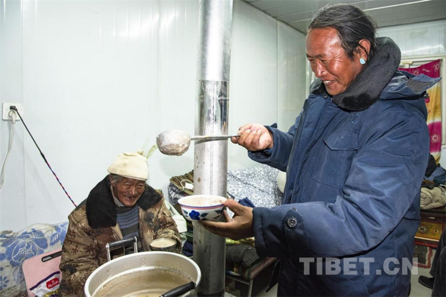 圖為震后第一個(gè)藏歷新年古突夜,在定日縣長(zhǎng)所鄉(xiāng)茶江村受災(zāi)群眾安置點(diǎn)里,村民扎西正在盛出熱氣騰騰的“古突”(攝于2025年2月27日) 攝影:趙振宇