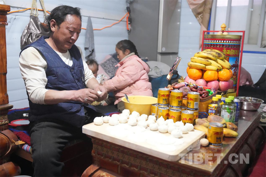 圖為震后的第一個(gè)節(jié)日“日喀則農(nóng)事新年”。這一天恰逢日喀則農(nóng)事新年古突夜與農(nóng)歷春節(jié)除夕相遇在同一日。在定日縣曲洛鄉(xiāng)措昂村安置點(diǎn)內(nèi),拉華一家正在包藏式餃子慶祝這一天(攝于2025年1月28日) 攝影:旦曲