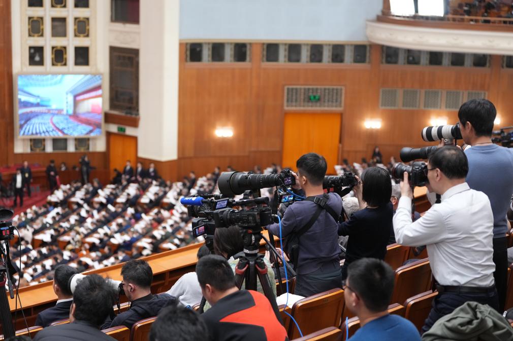 3月8日,十四屆全國人大三次會(huì)議在北京人民大會(huì)堂舉行第二次全體會(huì)議。這是記者在會(huì)場(chǎng)采訪。新華社記者 陳曄華 攝