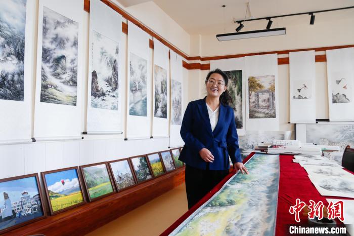 這幅彩墨山水圖出自全國人大代表、青海省海北藏族自治州門源回族自治縣第二寄宿制初級(jí)中學(xué)的美術(shù)老師郭金萍之手。